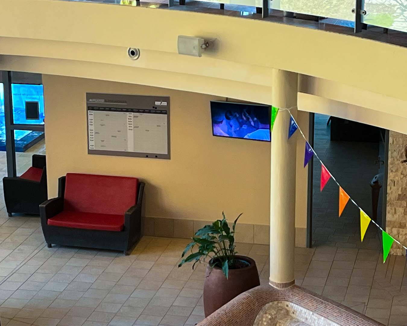 Die neue Videowall im Badebereich ersetzt sowohl eine manuell beklebte Tafel für die Aufgussplanung als auch einen einzelnen Screen. Nun werden die tagesaktuellen Aufgusspläne, Eventankündigungen, Angebote und Serviceinfos digital präsentiert.