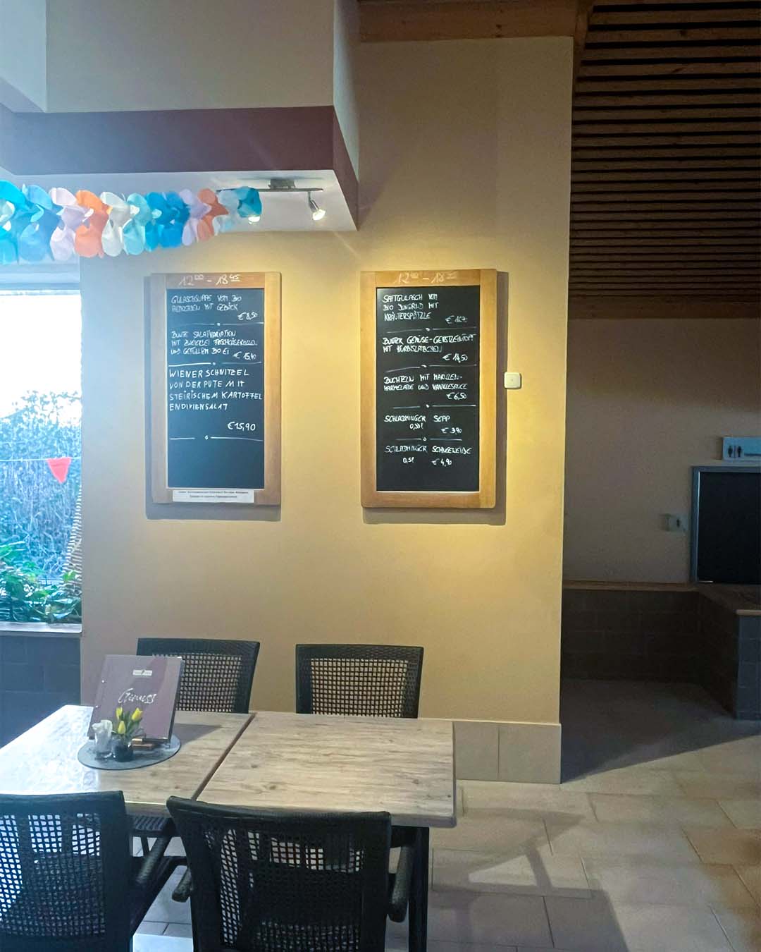 Statt handgeschriebener Kreidetafeln mit Tagesangeboten informieren jetzt zwei 43“-Screens zentral an der Wand über Menüs und Preise. Neben der besseren Orientierung verkürzt die mediale Bespielung die gefühlte Wartezeit im Gastraum. Gleichzeitig können Änderungen im Speisenangebot nun flexibel und schnell eingespielt werden.