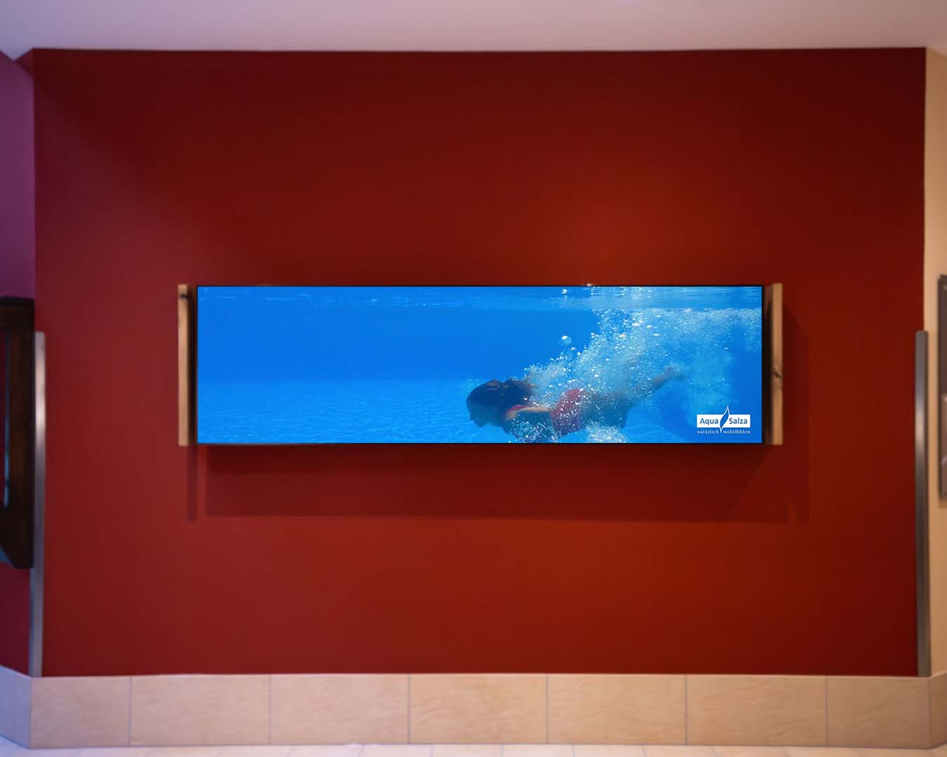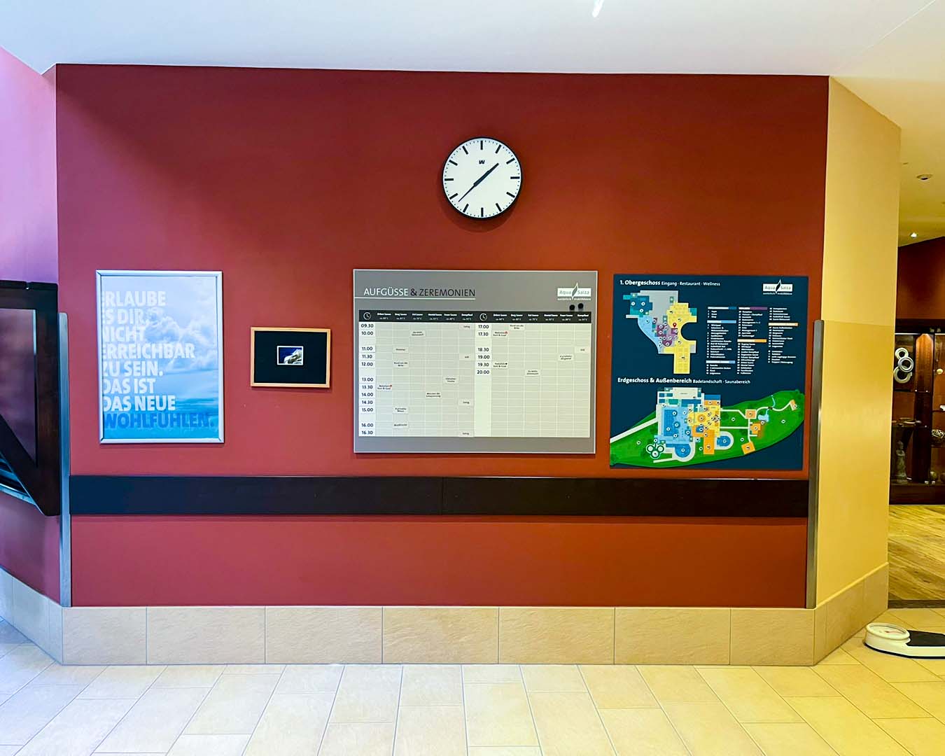 Wo zuvor ein händisch erstellter Saunaaufgussplan, ein Plakat, ein gerahmtes Bild und eine Tafel mit dem Lageplan nebeneinander hingen, sorgt nun eine Videowall aus zwei 55“ Screens für elegante Übersicht. Alle Inhalte werden digital gebündelt und professionell dargestellt – von Lageplänen über Hinweise bis zu Aktionen.