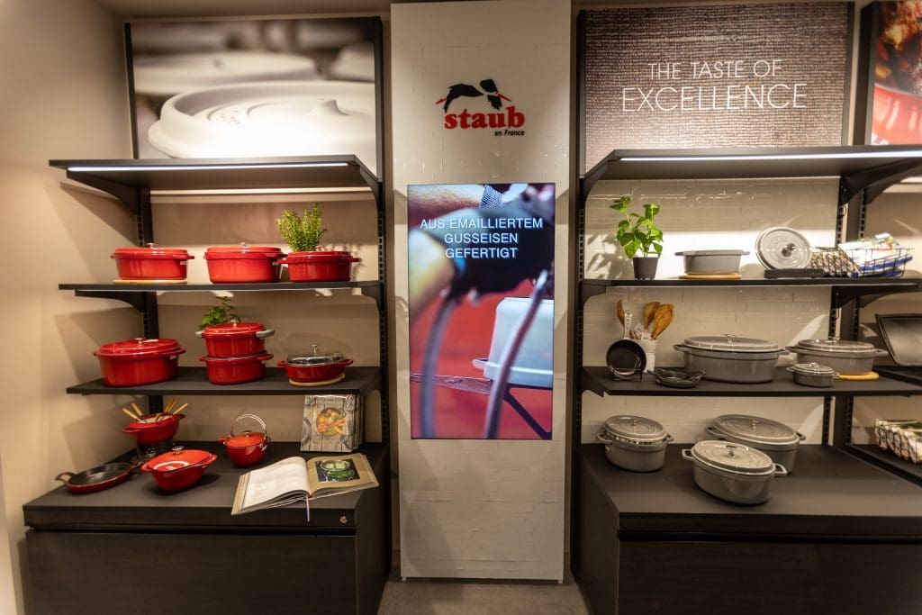 Zur Unterstützung der unterschiedlichen Markenwelten von Zwilling, Staub, Demeyere, Ballarini und Miyabi wurden insgesamt sieben 55“ Displays im Portraitformat in den Ladenbau integriert.